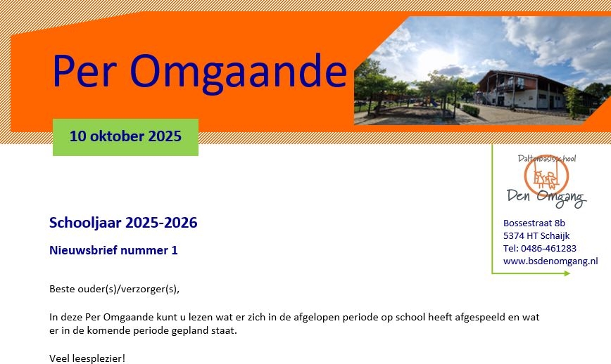 De Per Omgaande is hét informatieblad voor ouders (en kinderen) van onze school. Elke vrijdag voorafgaand aan een vakantie wordt de Per Omgaande via het ouderportaal met alle ouders gedeeld.